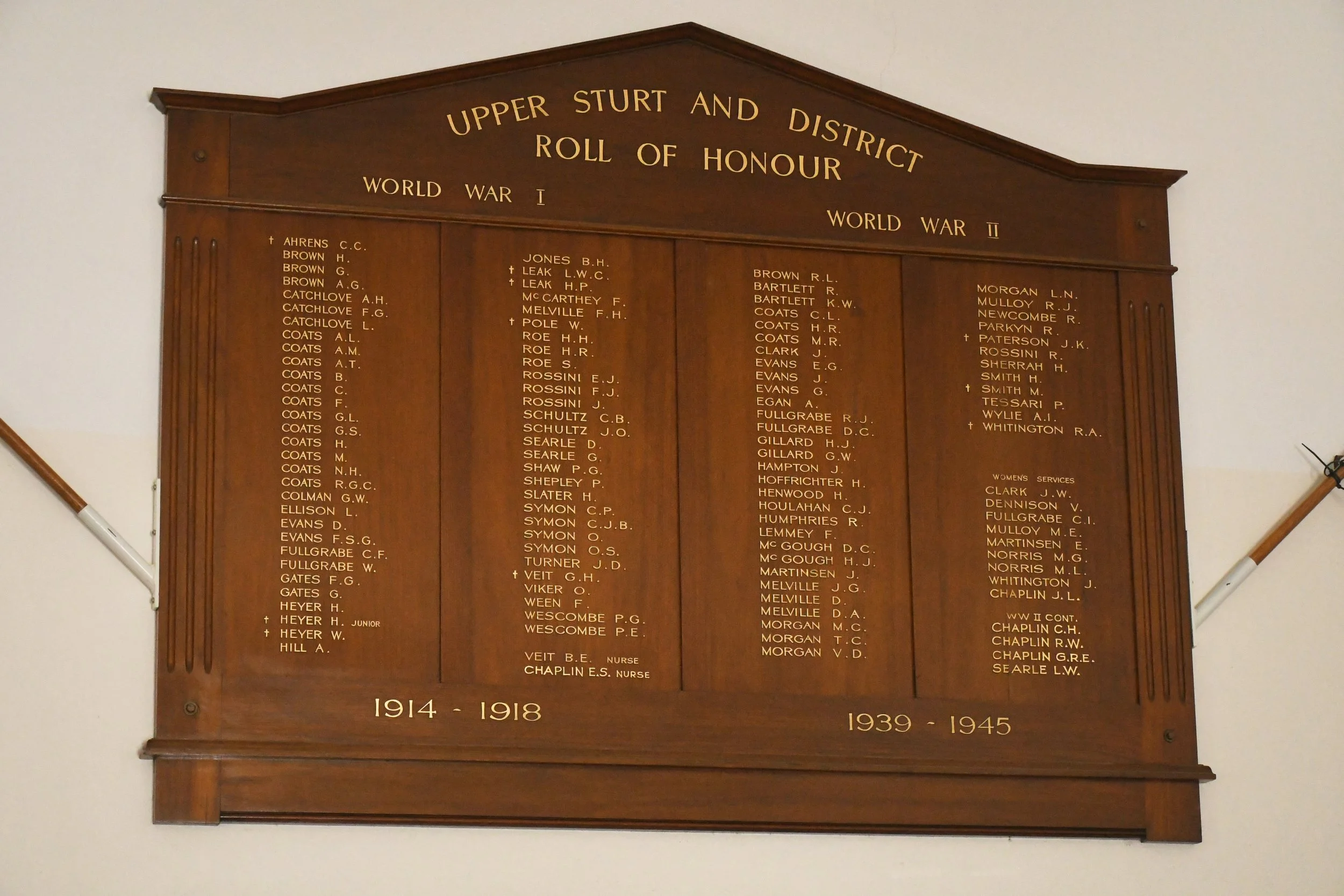 Annually, a Strawberry Fair is held on the first Saturday in November. Services are held on Anzac Day and Remembrance Day, with the Honor Roll and stained-glass window contributing to the commemorations. An Art Exhibition takes place, and the CWA meets monthly. The hall remains a living soldiers' memorial for the Upper Sturt district and the community.